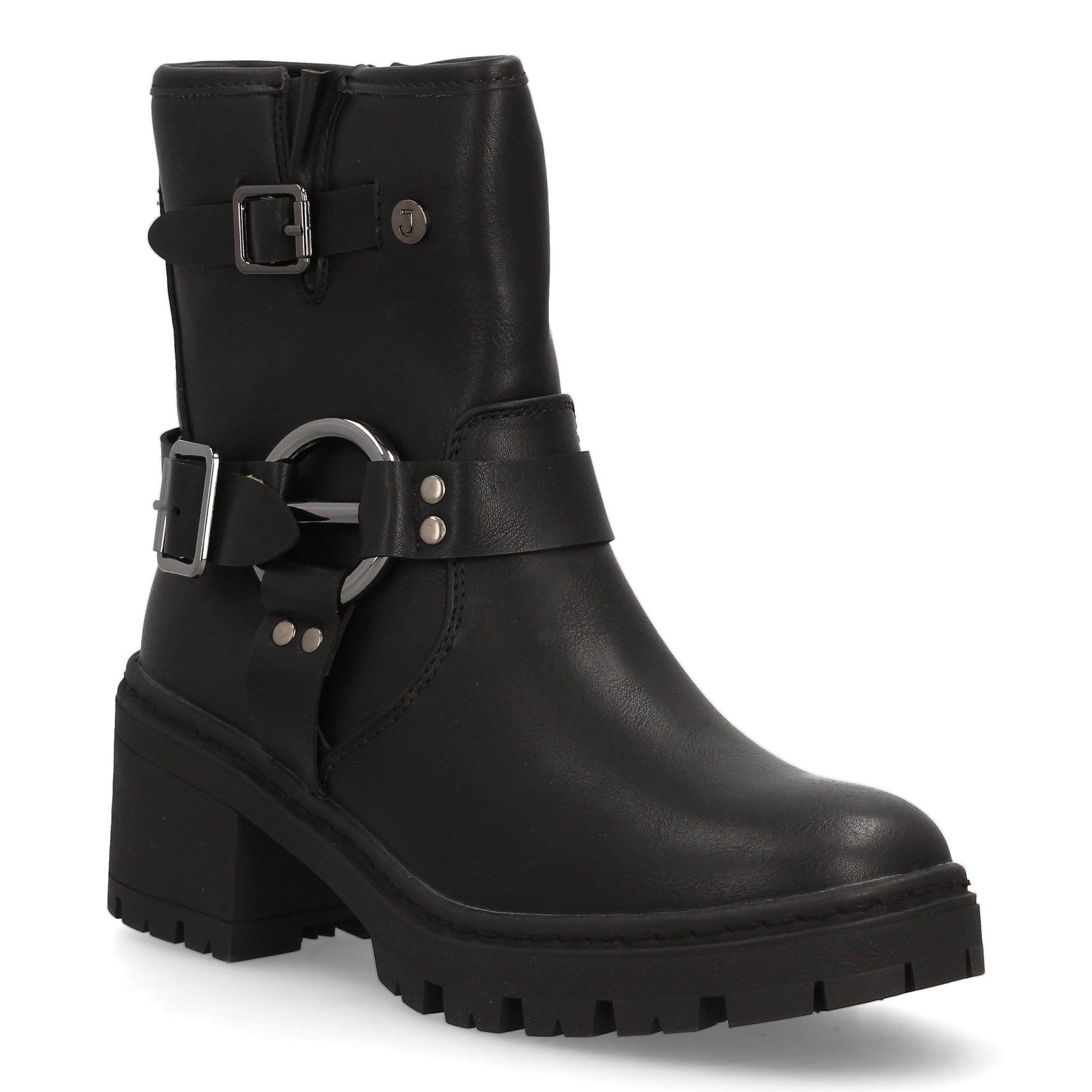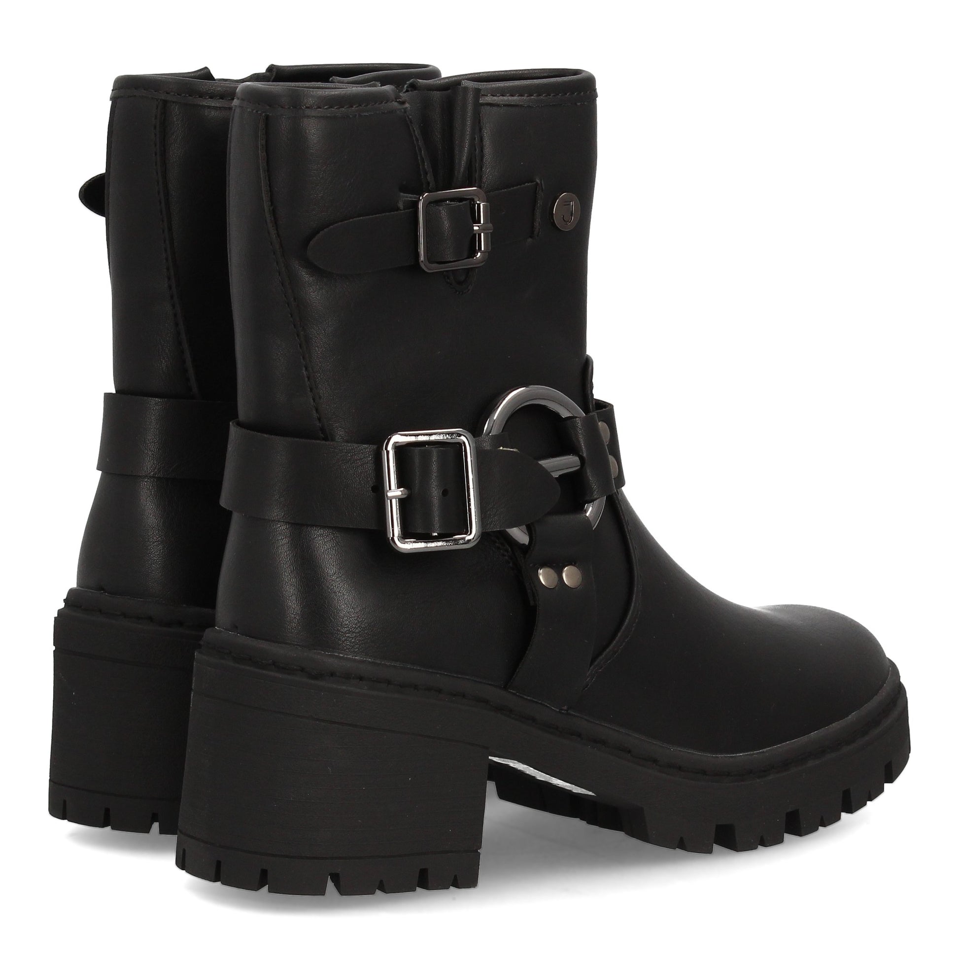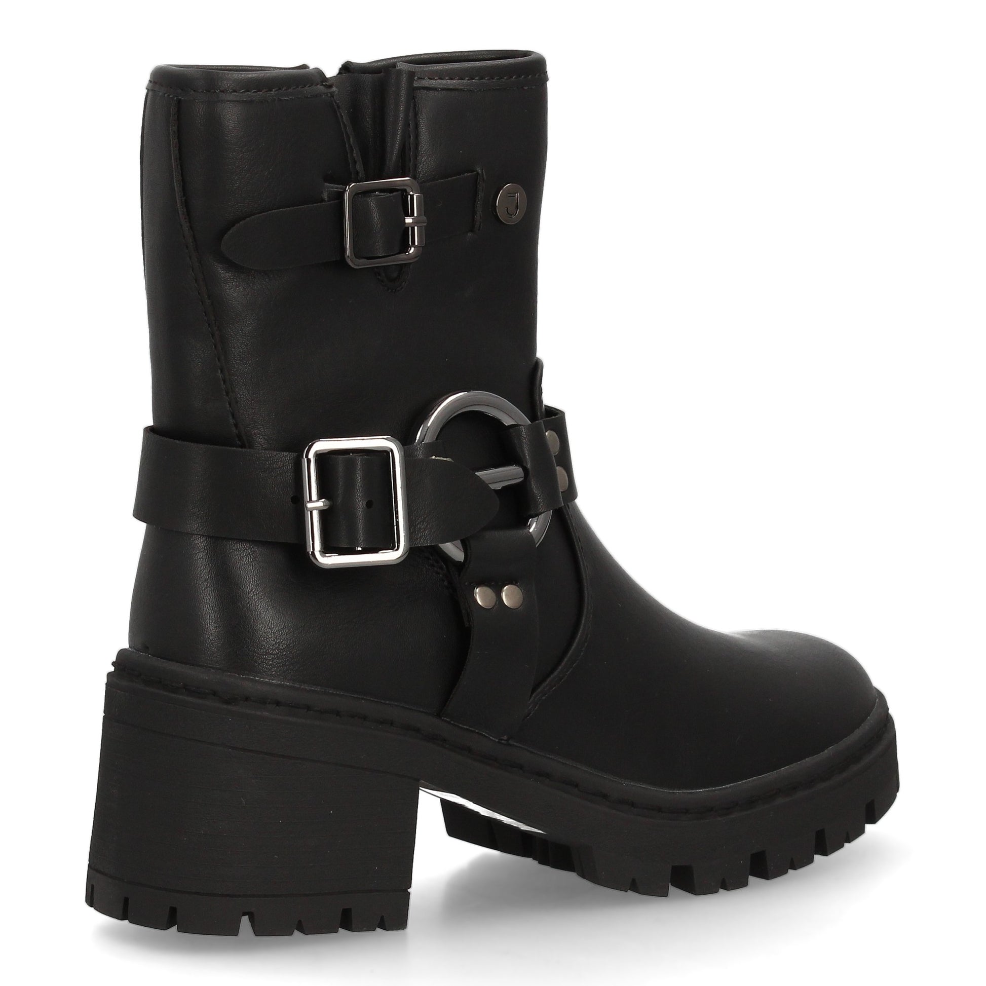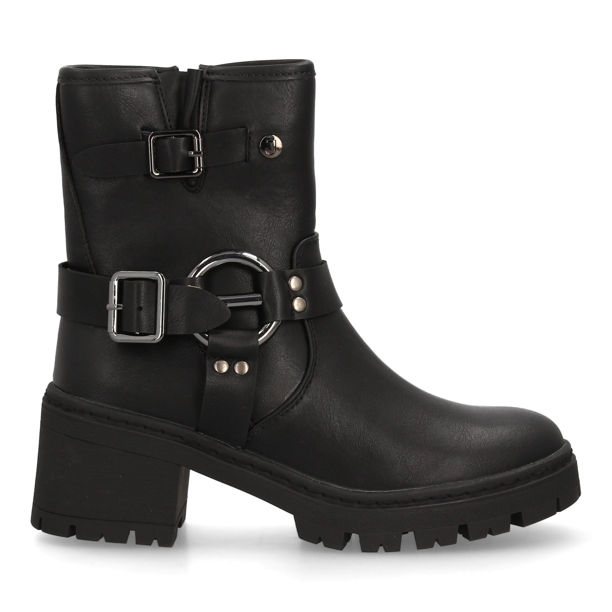 Botín de mujer estilo biker en color negro con caña media. Cuenta con un práctico cierre lateral de cremallera. Destaca por la doble hebilla decorativa con aros metálicos que refuerzan su estética rebelde. La suela es gruesa con un tacón ancho que ofrece altura y comodidad. El botín ideal para darle un toque rockero y trendy a tus outfits de otoño-invierno.