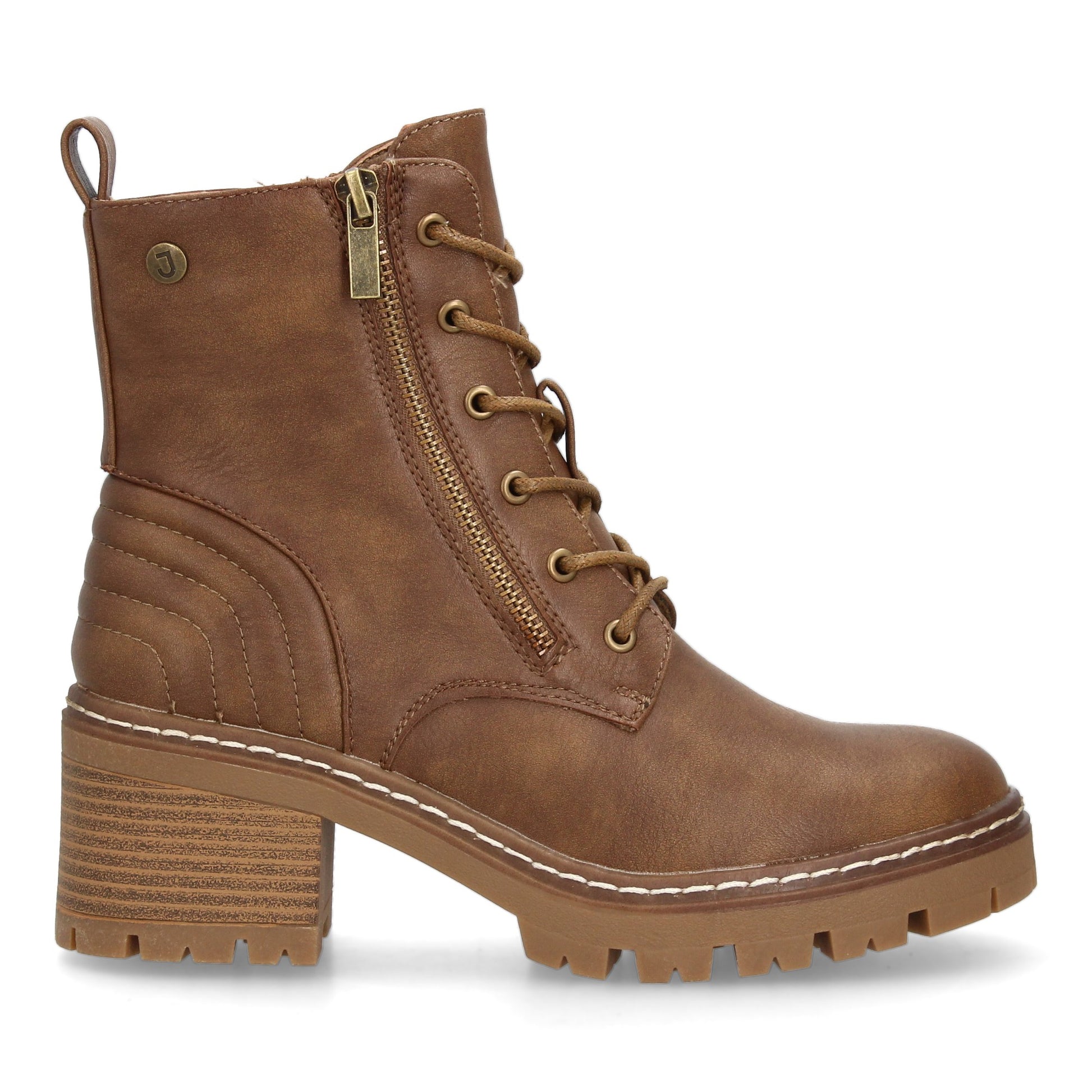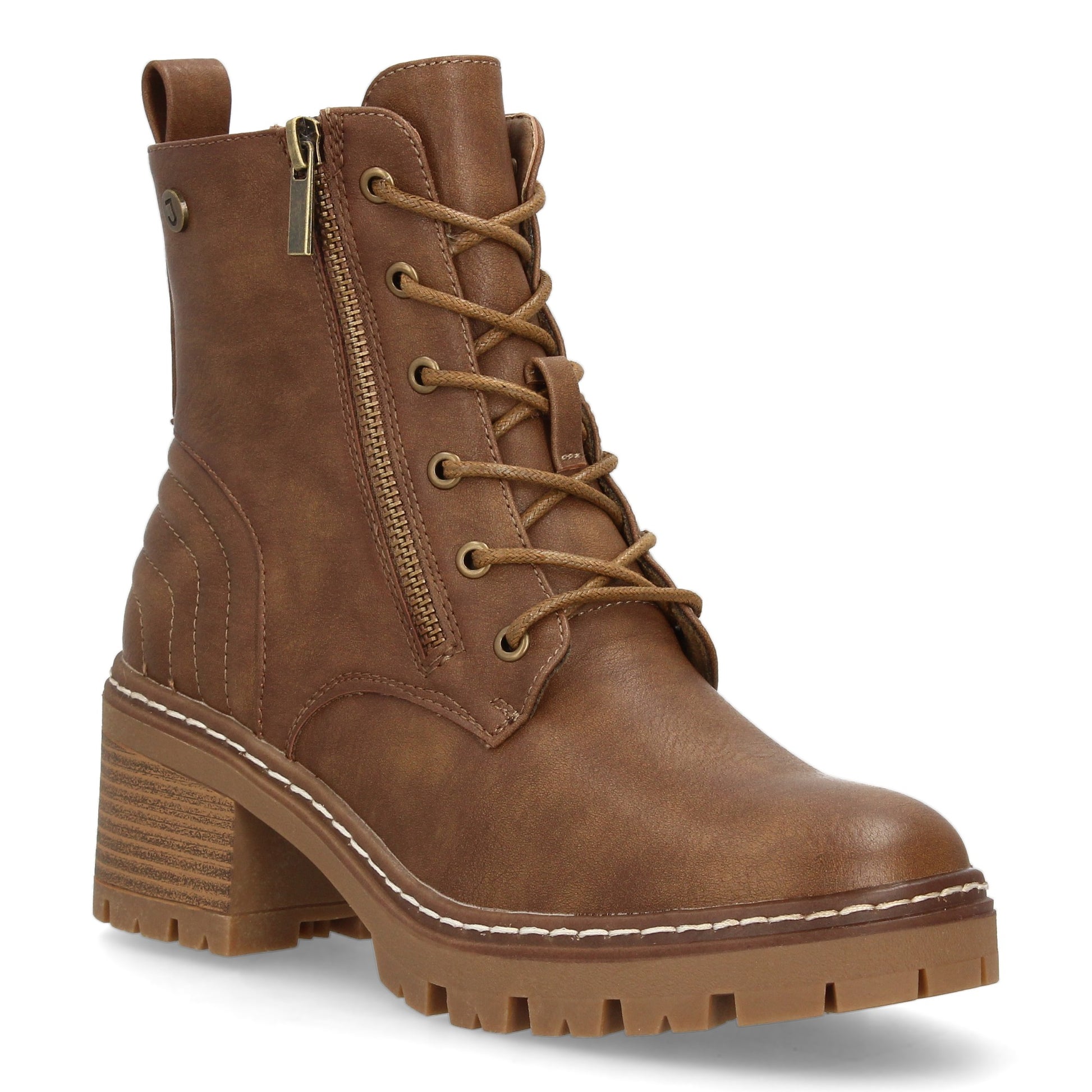 Botín de mujer estilo militar en un cálido color cuero (marrón). Ofrece un doble cierre de cordones frontales y cremallera lateral, facilitando el ajuste personalizado y la rapidez al calzar. Incluye detalles acolchados y costuras decorativas que añaden textura y confort. Un modelo robusto y estiloso, ideal para protegerte del frío en otoño e invierno.