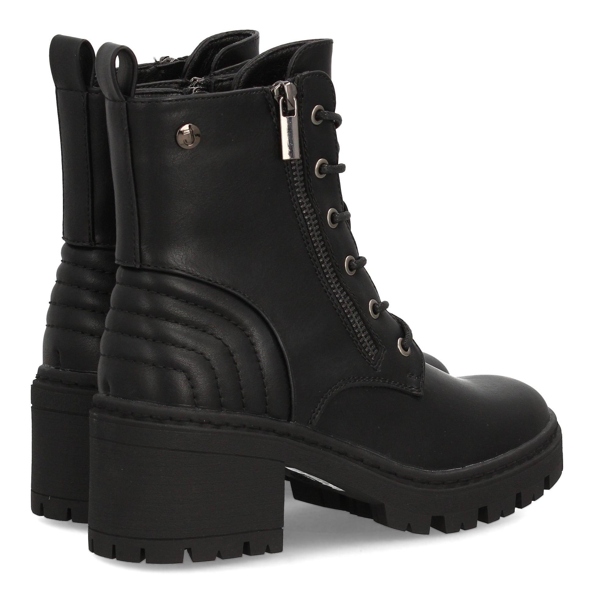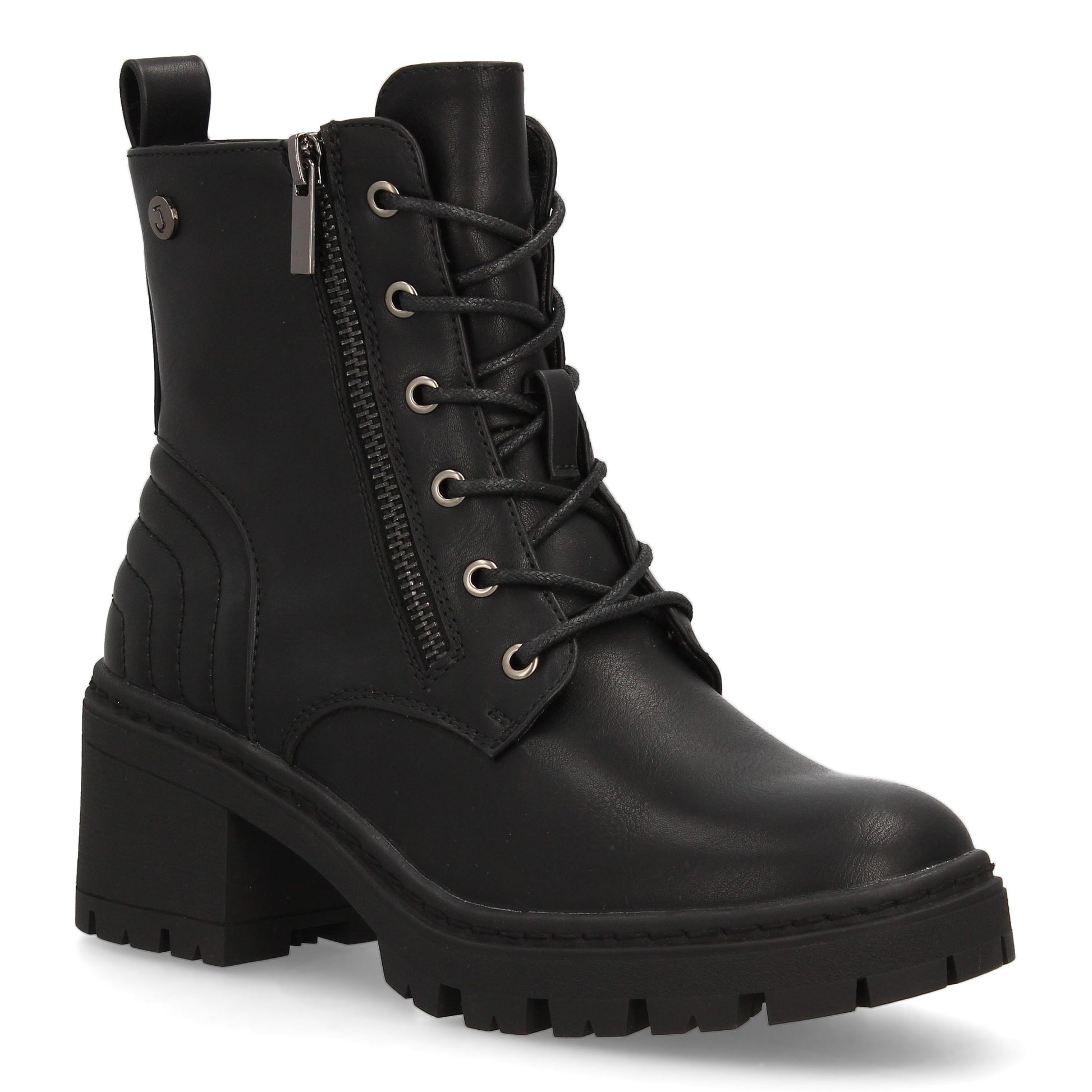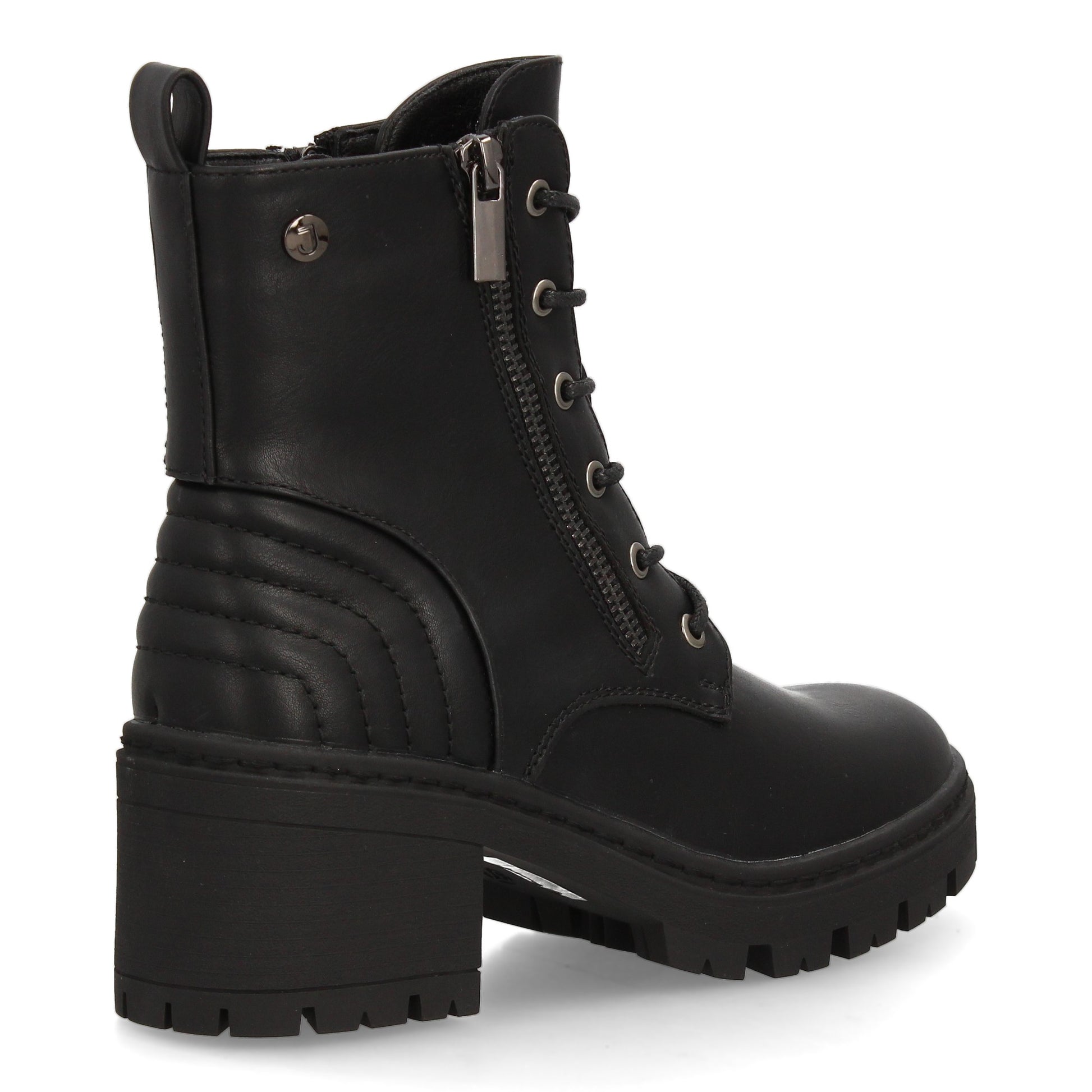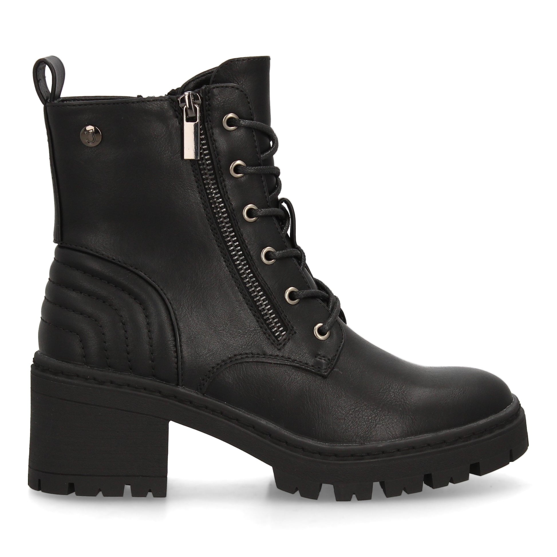 Botín de mujer estilo militar en color negro, un básico atemporal. Combina el cierre de cordones para un estilo auténtico con una práctica cremallera lateral para un ajuste fácil y rápido. Destaca por sus detalles acolchados y costuras decorativas. Una opción cómoda y versátil con suela resistente, perfecta para el uso diario durante el otoño y el invierno.