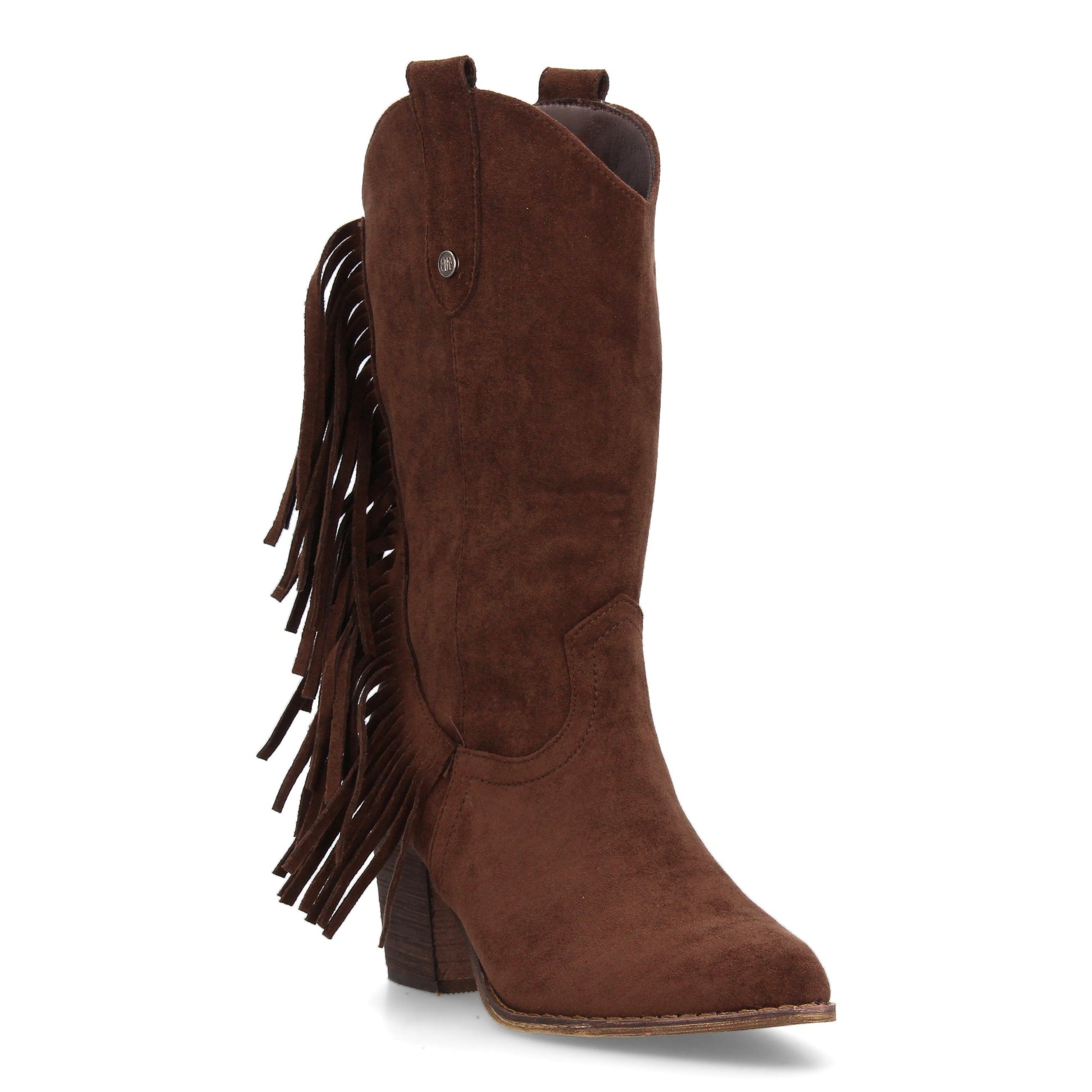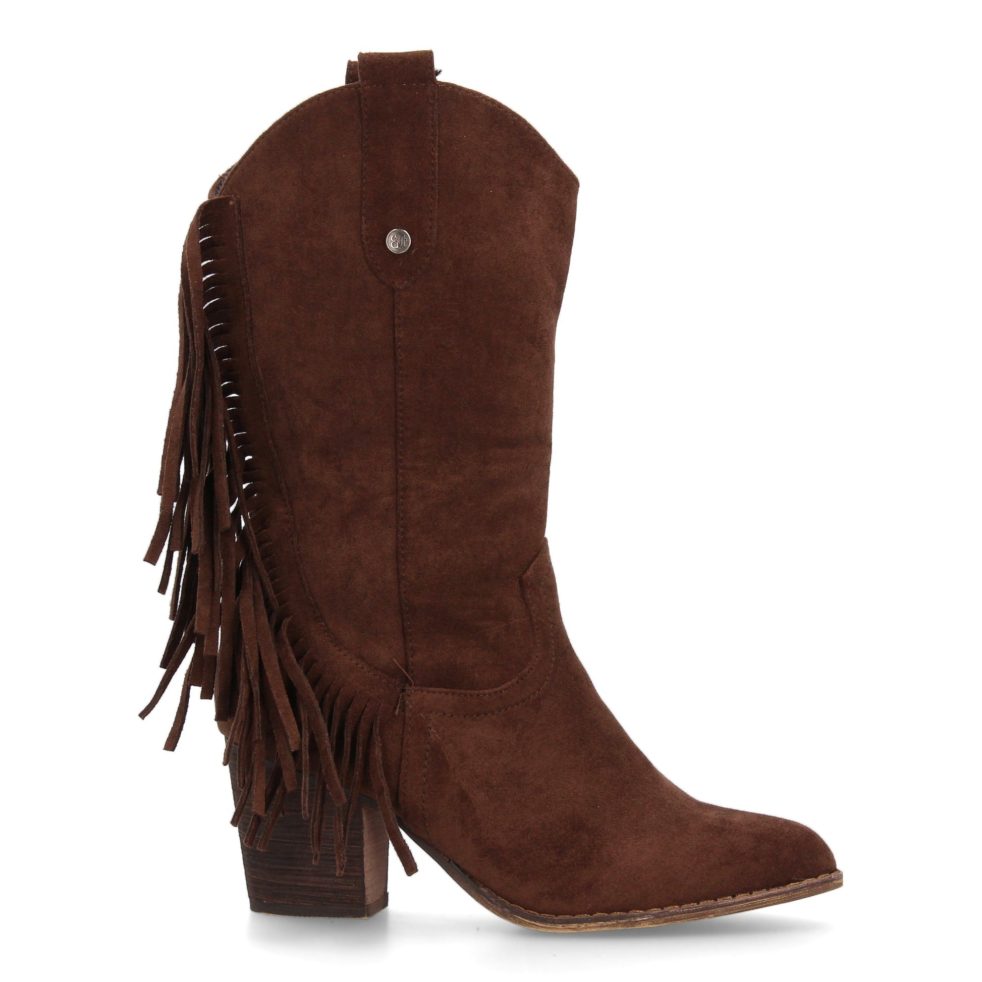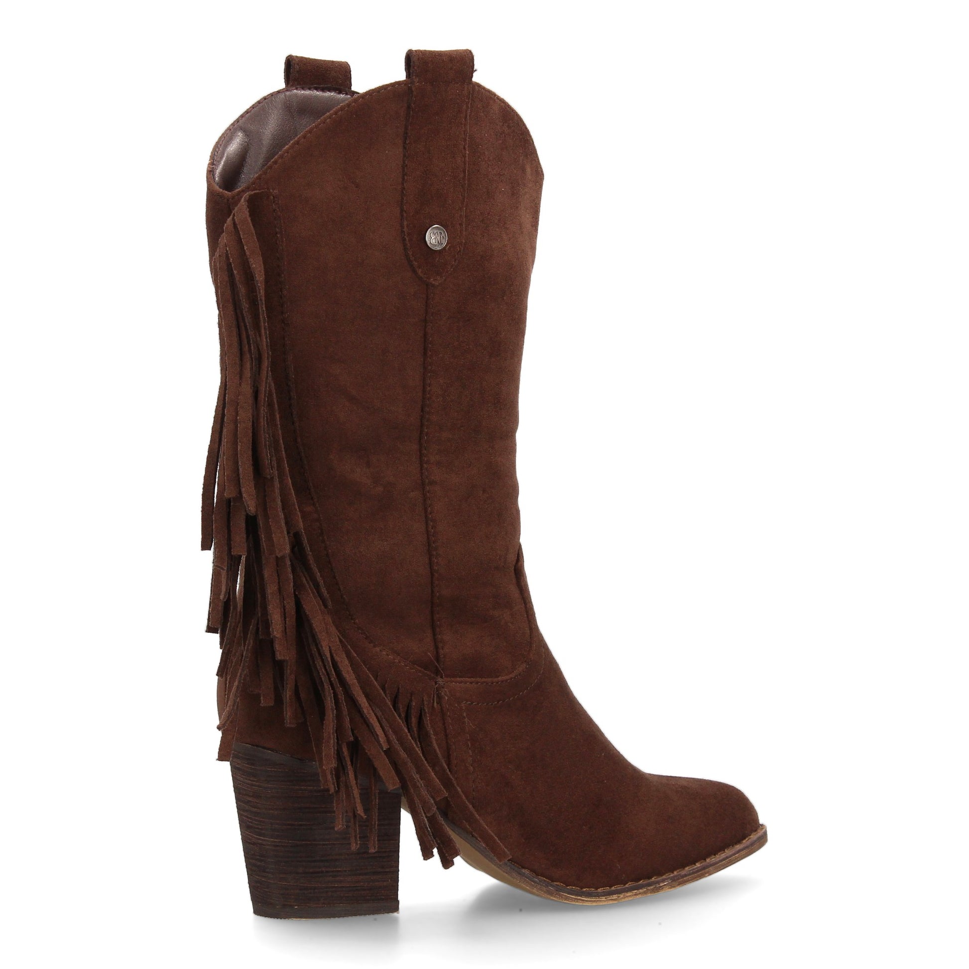 Elegante bota de media caña estilo cowboy en un profundo color café. Un diseño que llama la atención por el detalle de flecos laterales, un elemento clave del estilo western. Equipada con un tacón ancho de altura media para un soporte cómodo y tiradores. Su cierre lateral con cremallera proporciona un ajuste sencillo. La opción perfecta para el look de otoño-invierno.
