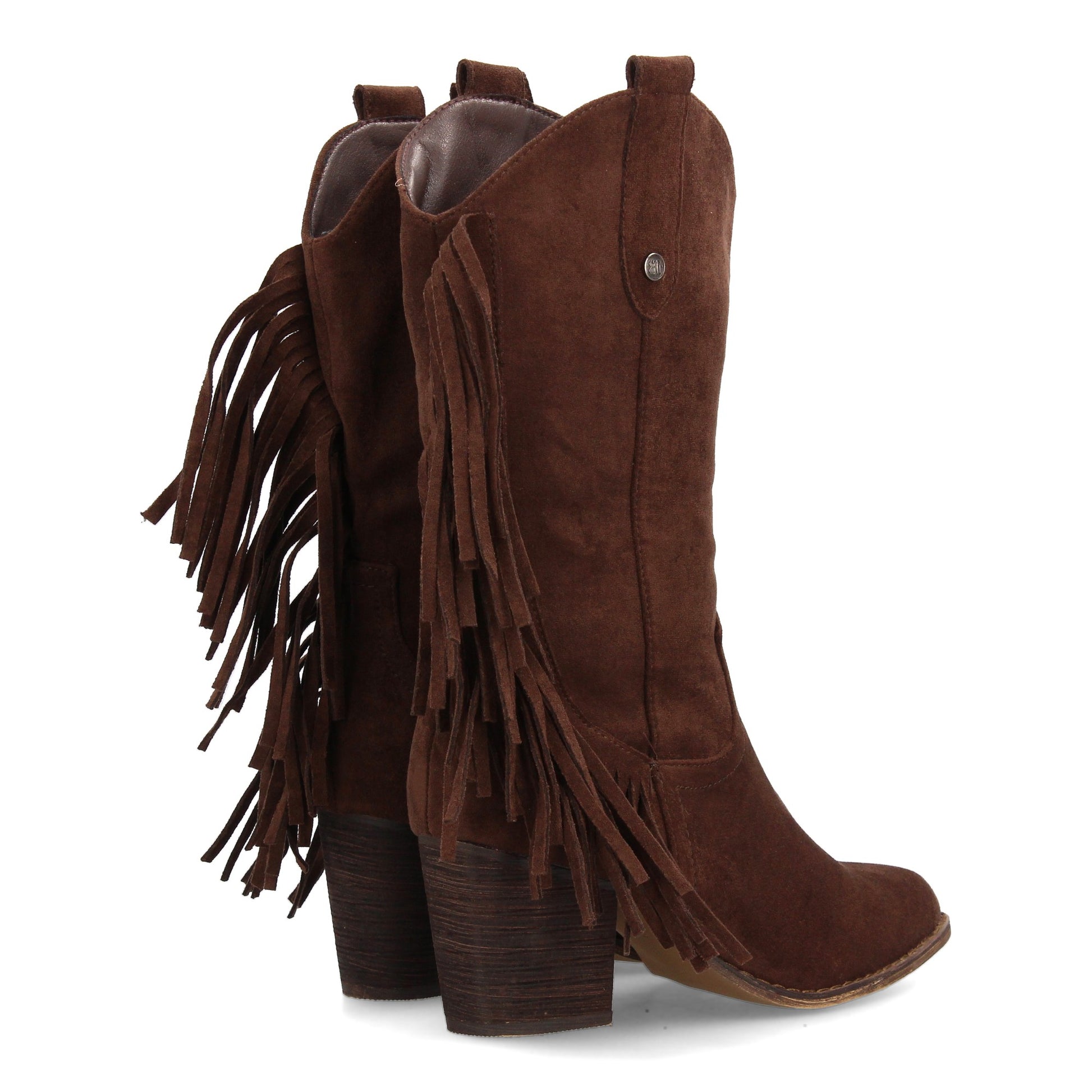 Bota Cowboy Media Caña Café con Flecos y Tacón Ancho