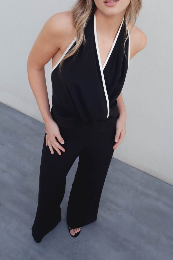 Detalles: Con cuello halter y escote lágrima frontal, este mono destaca por los vivos combinados a contraste y un corte recto de pernera ancha. Cierre con cremallera oculta en costura y botones ocultos en el cuello.