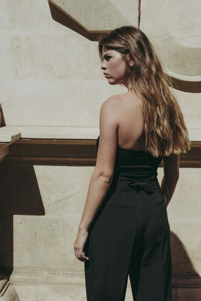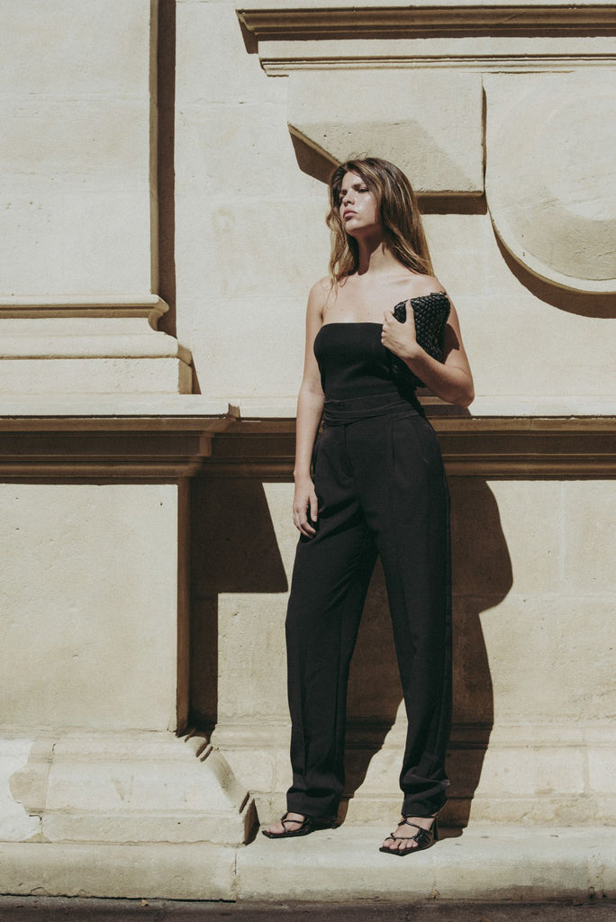 Este pantalón combina comodidad y estilo con su tejido de algodón y un fajín integrado que estiliza la figura. Ideal para looks de oficina o casuales.