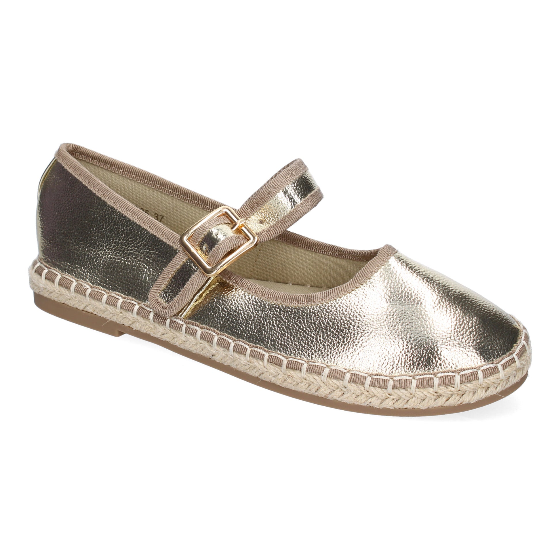 Bailarina tipo alpargata de mujer en color oro, confeccionada con yute. El diseño moderno y el acabado brillante la hacen destacar. Ofrece comodidad y un ajuste óptimo gracias a su cierre de hebilla. Ideal para dar un toque de luz y elegancia a tus outfits de primavera-verano.